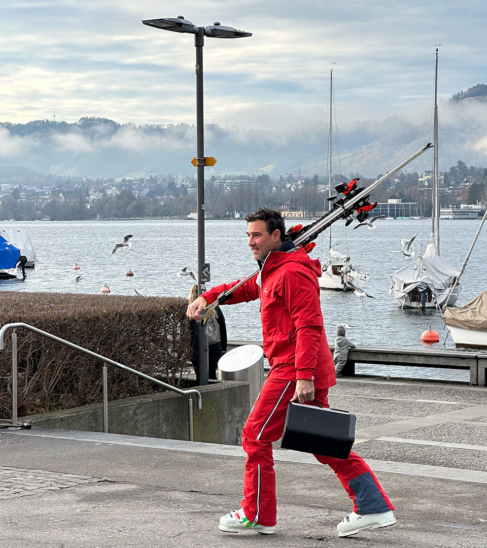 Ergänzt haben wir den XXL-Ski aus der Werkstatt der Reto Melchior GmbH durch eine einmalige Inszenierung an der Zürcher Seepromenade. Unter dem Motto «Vorbereitung ist alles» versammelten wir zahlreiche Statistinnen und Statisten sowie spontane Passantinnen und Passanten zu einem Aufwärm-Flashmob – angeleitet durch Salar Bahrampoori, TV-Moderator und eidgenössisch diplomierter Schneesportlehrer.
