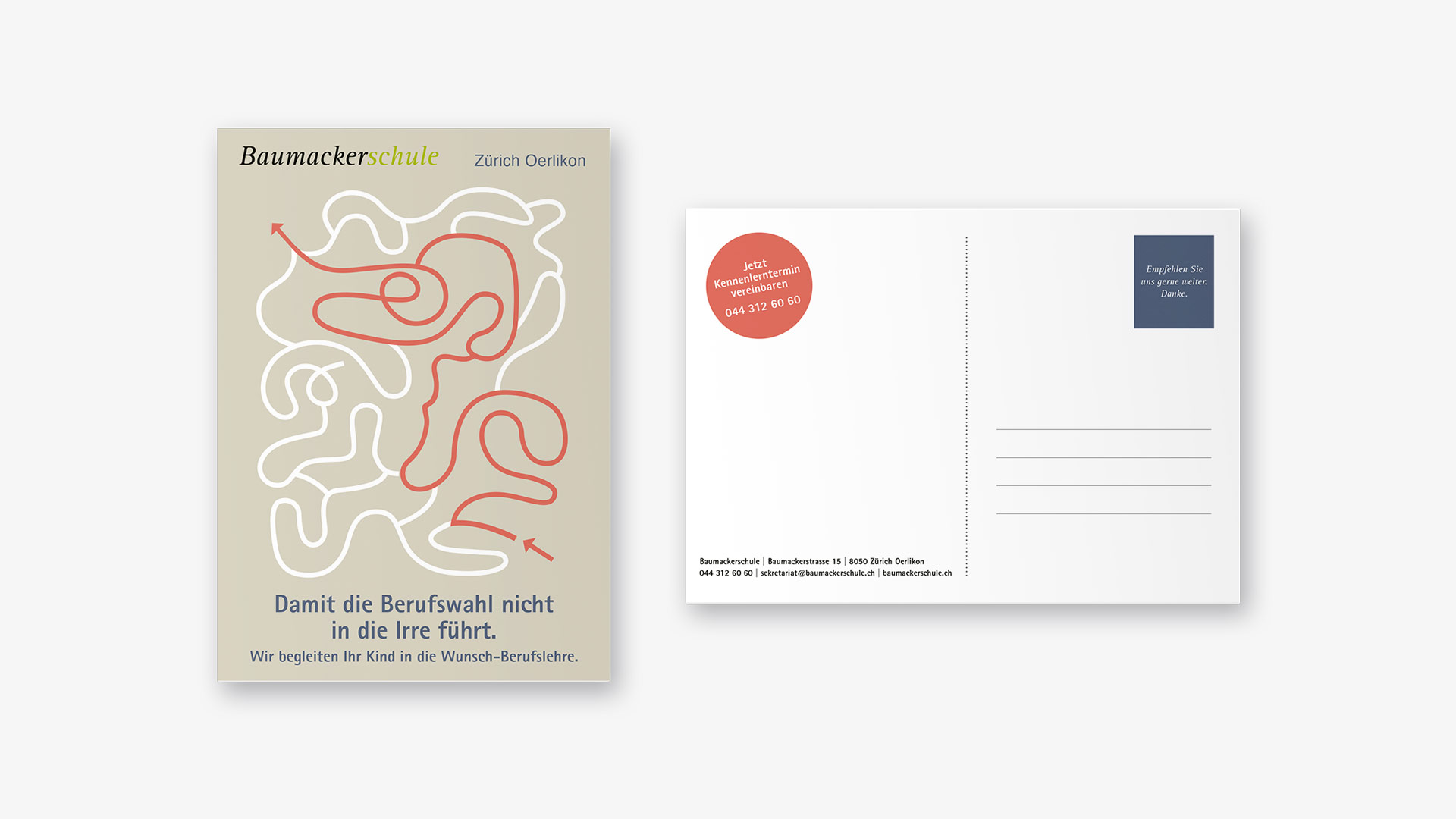 Wir dürfen die Baumackerschule seit mehreren Jahren in Kommunikation und Marketing unterstützen. In einem ersten Schritt haben wir uns auf die strategischen Hausaufgaben konzentriert. Dabei haben wir eine klare Customer-Journey-Strategie definiert sowie die entsprechenden (Digital-) Tools aufgebaut und optimiert. Im nächsten Schritt haben wir die Leitidee «Wir stärken Ihr Kind und führen es in die (Wunsch-) Berufslehre» entwickelt. Alle Kampagnen und Massnahmen führen zu einem persönlichen Kennenlernen der Schule sowie der Schulleitung. Denn dort wird ganz schnell klar, warum die Baumackerschule der perfekte Ort ist, um die Sekundarschule zu absolvieren.