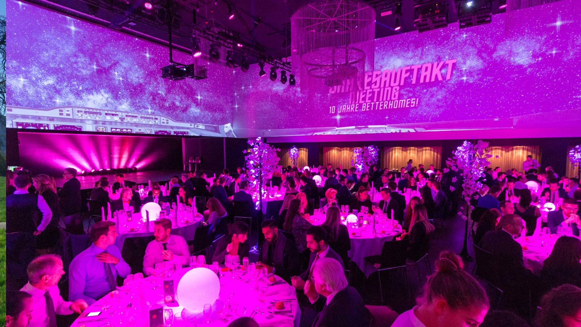 Eine magentafarbene Betterhomes-Welle flutete über die 360° Projektion den Raum. Die gesamte Meilenstein-Präsentation wurde dann ebenfalls über die Projektion gezeigt.