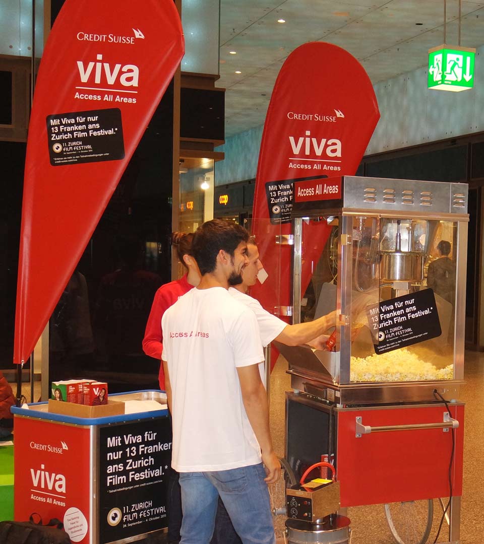 Passend zum Thema verteilten wir zudem über 70’000 Sachets Popcorn sowie Credit Suisse Viva-Flyer an die Zielgruppe. Unsere Promotoren waren dafür während einer Woche an diversen Standorten im Kanton Zürich im Einsatz.