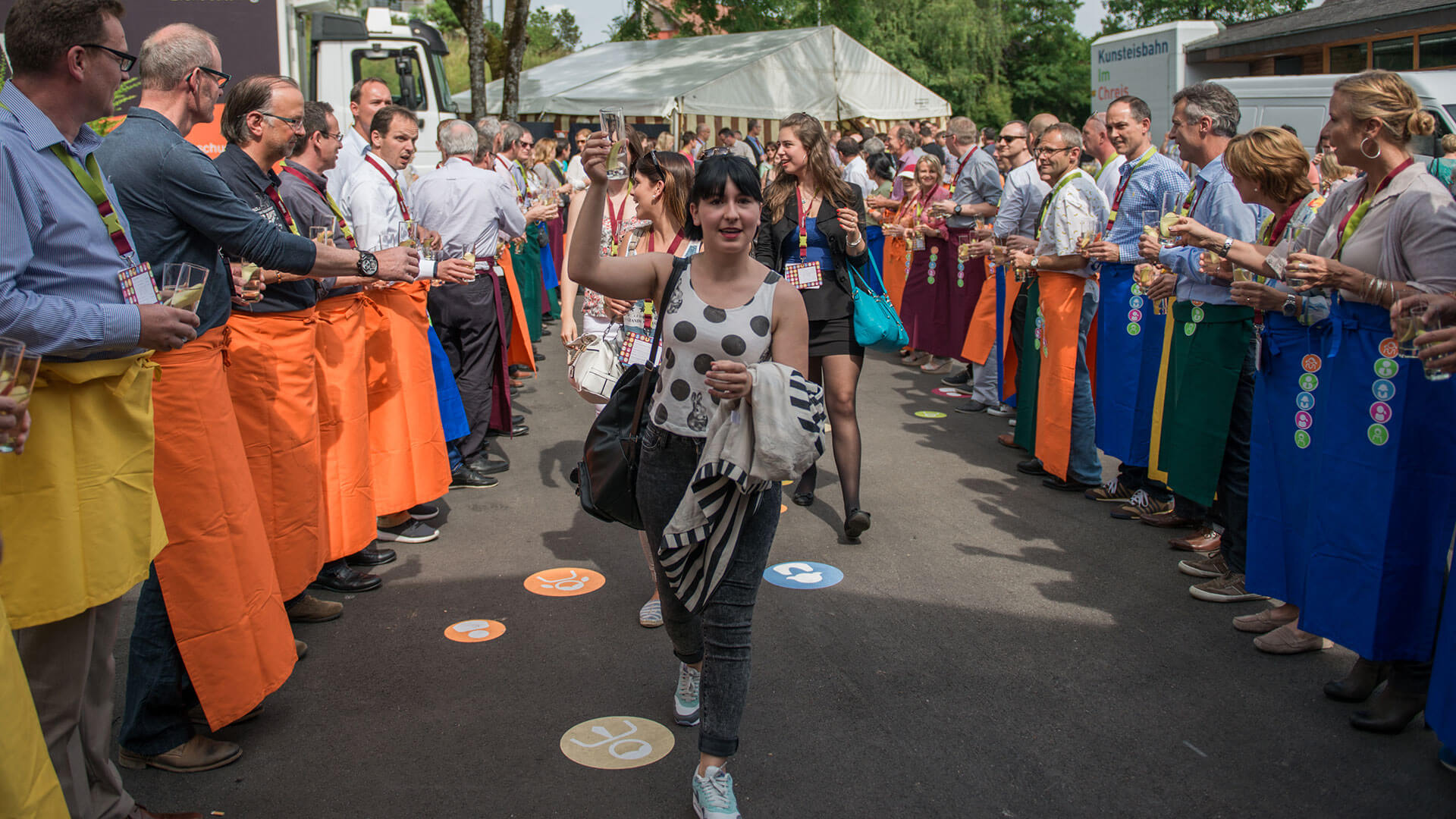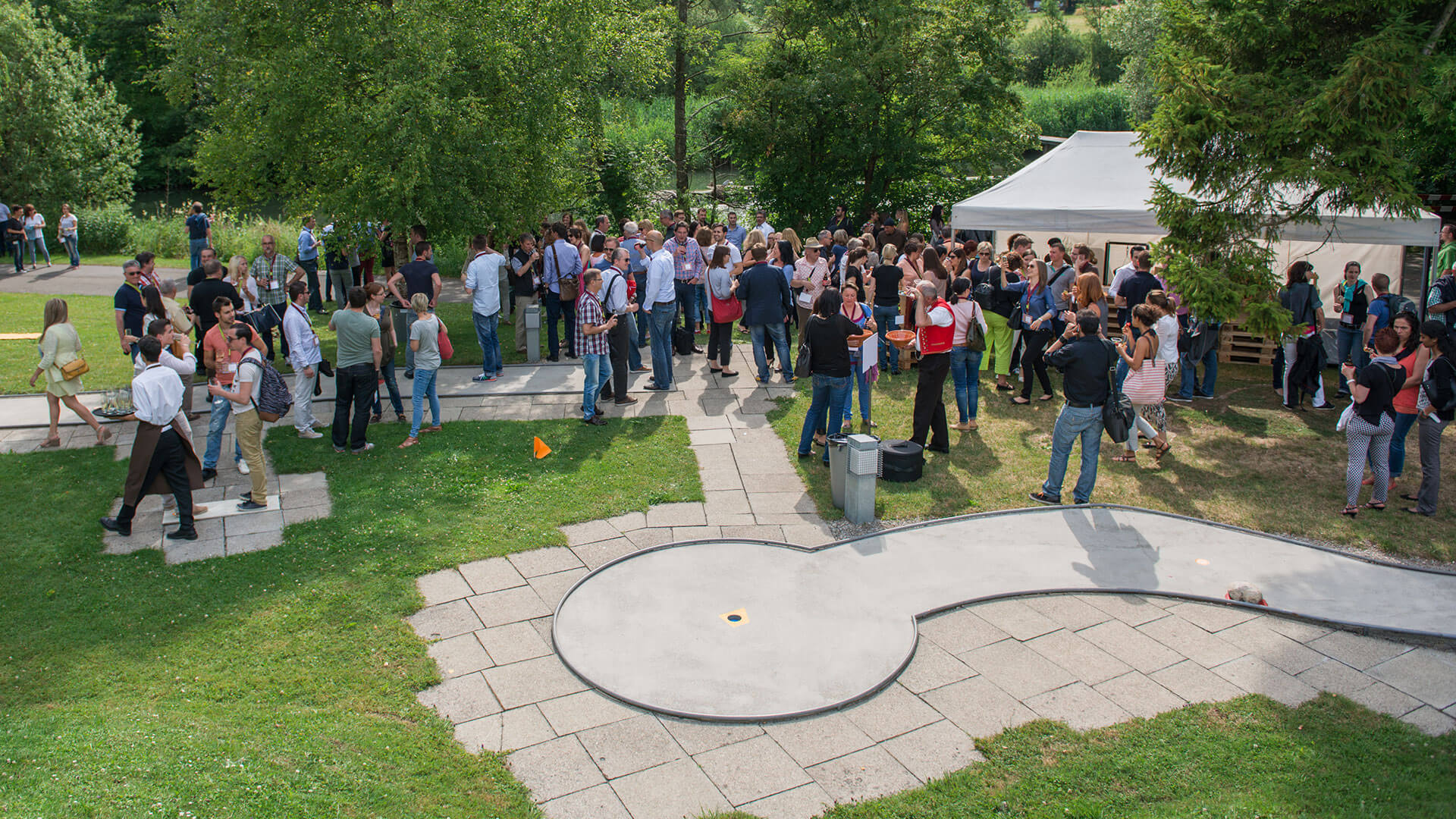 Die Gäste zirkulierten dynamisch durch die Regionen mit Aktivitäten wie zum Beispiel Minigolf, Kuhmelken, Fotostation und Talerschwingen.