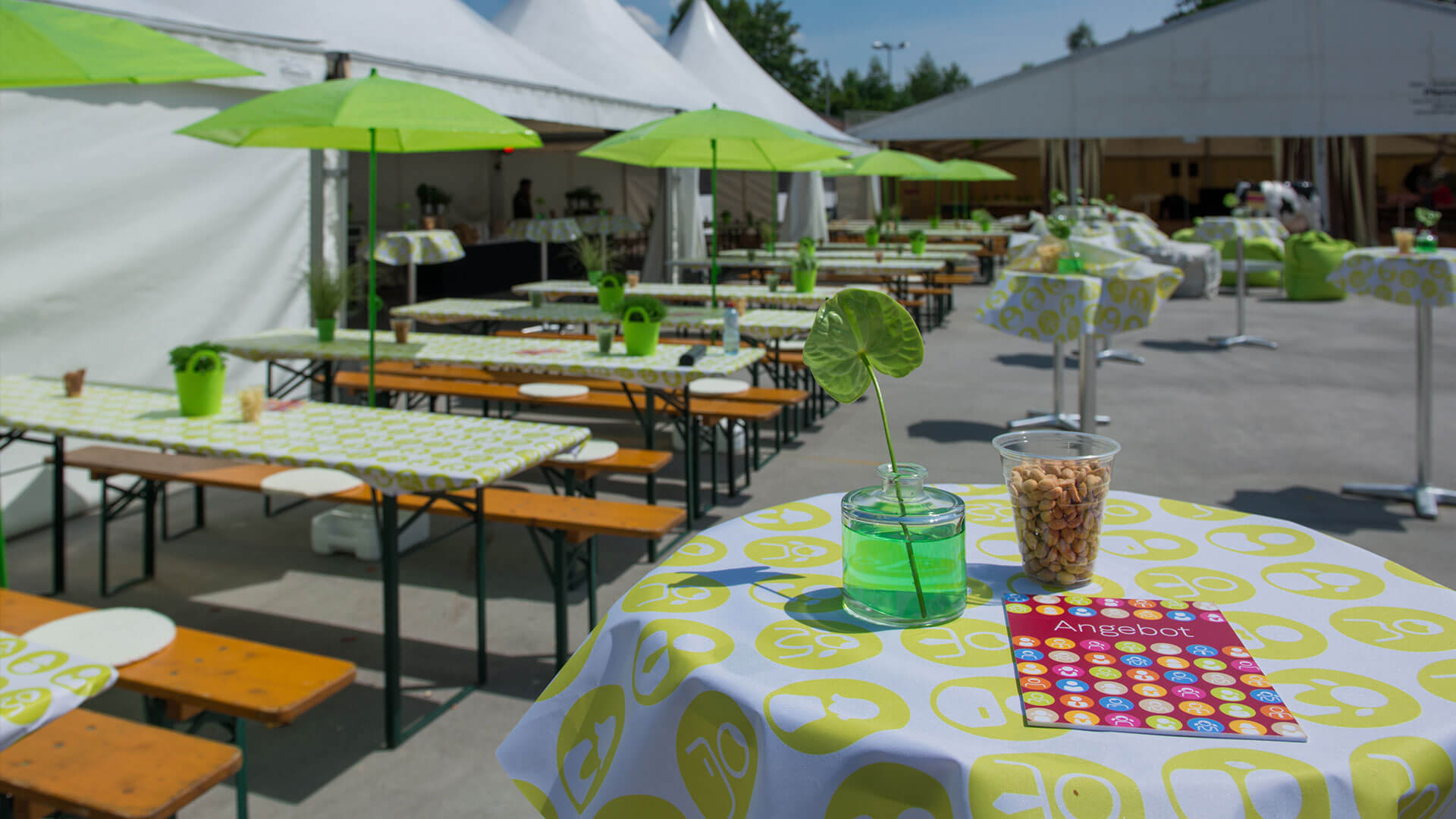 Das Gelände wurde in fünf Schweizer Regionen unterteilt, wobei Dekoration und kulinarische Köstlichkeiten die Bereiche voneinander unterschieden.