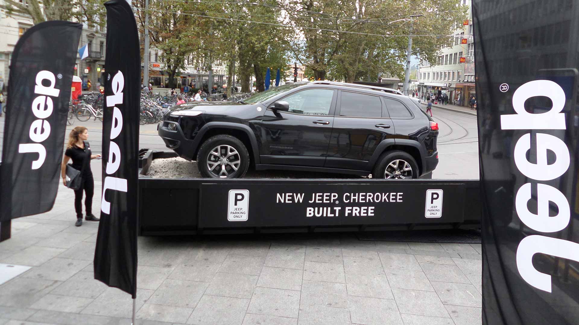 Aufbauend auf einem kurzen Viral Spot, bei dem ein Jeep® Cherokee mangels Parkplätzen auf einer Baumulde abgestellt wird, brachten wir dasselbe Sujet direkt auf die Strasse. In Zürich, Bern, Luzern und St. Gallen war der Jeep® auf der Baumulde zu erleben. Unterstützt wurde die Promotion durch lokale Händler.