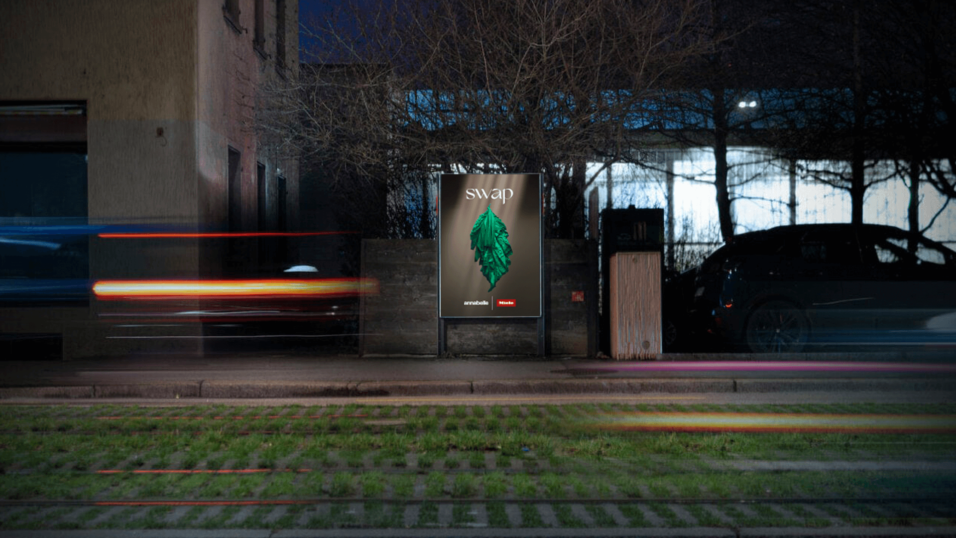 Um Miele und die Wäschepflege-Kampagne auf dem SWAP-Event optimal zu präsentieren, haben wir eine innovative Konzeptidee entwickelt und umgesetzt. Das Highlight war der Stand auf der Bühne des Kaufleuten, der mit leuchtenden Cubes gestaltet wurde, die an Miele-Waschmaschinen erinnerten. Diese Cubes dienten als Präsentationsfläche für Kleidungsstücke, die zum Tausch angeboten wurden, und schufen eine direkte Interaktion mit den Besucher*innen. Zusätzlich wurde das Keyvisual im Raum in Form von hängenden Kleidern in 3D ausgearbeitet und über den Cubes angebracht. Dies verstärkte den visuellen Eindruck und die Brand Awareness von Miele.