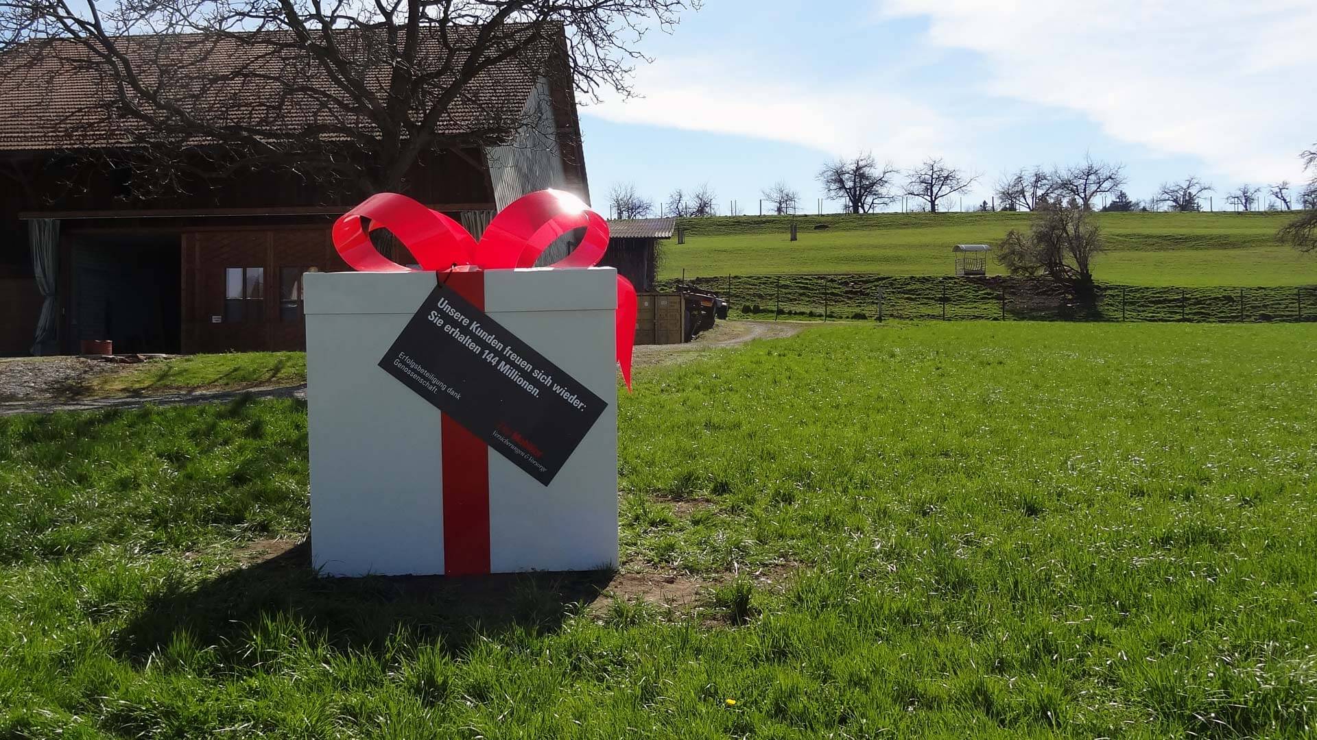 Die Mobiliar beteiligt ihre Kundinnen und Kunden am Geschäftserfolg, genossenschaftliche Verankerung sei Dank. Zur Kommunikation des Überschussfonds zeichnen wir seit Kampagnenbeginn für das Projektmanagement und die gesamte Logistik der Riesenpakete verantwortlich, die jeweils an über 100 Standorten in der ganzen Schweiz aufgestellt werden. Partneragentur ist Wirz.