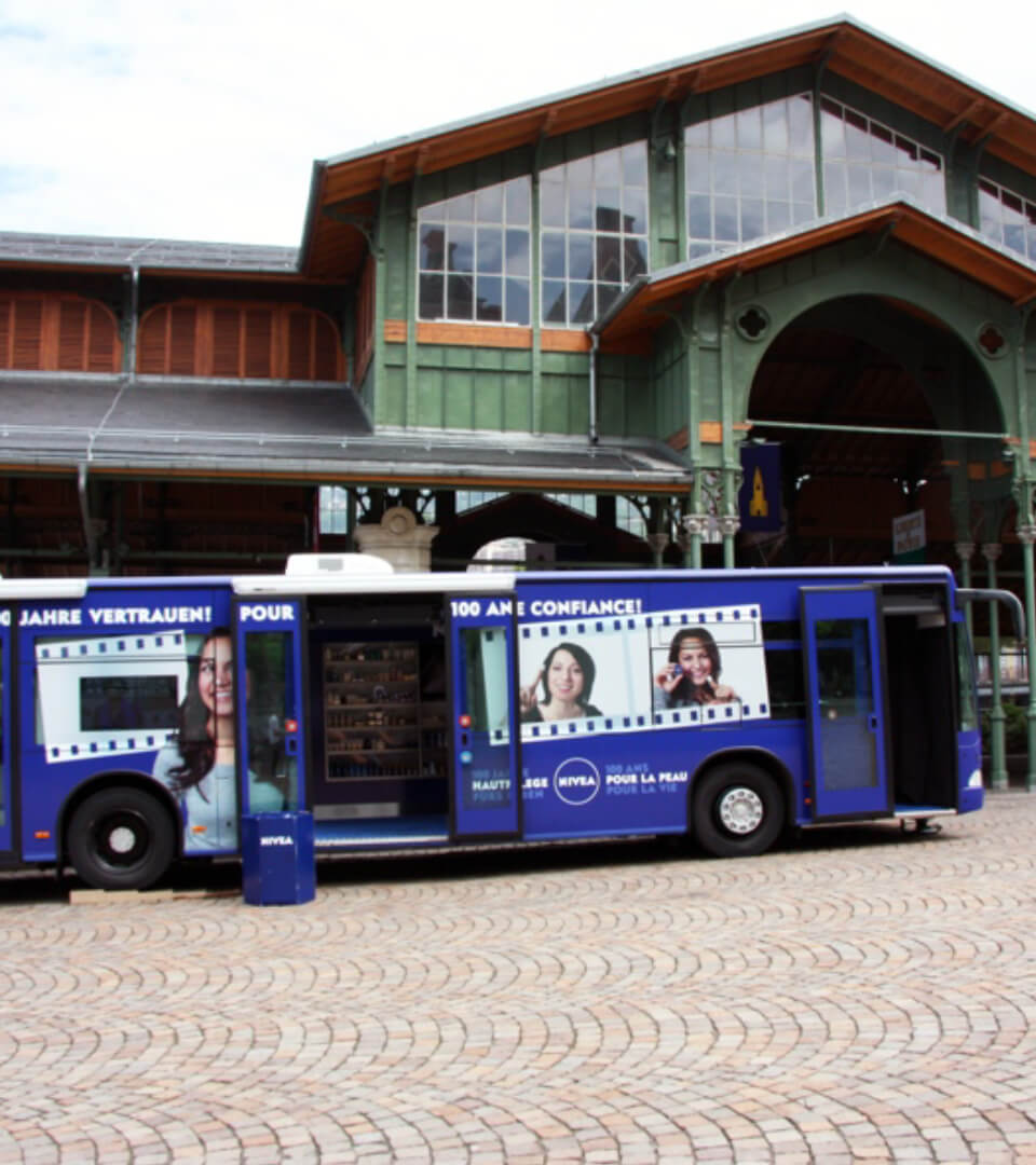 Zusätzlich tourte der Nivea Jubiläumsbus durch viele Schweizer Städte und Gemeinden. Im Umfeld des Busses wurden Retro-Nivea-Dosen verschenkt und Kamerateams erstellten Tupf-Filme von interessierten Passanten.