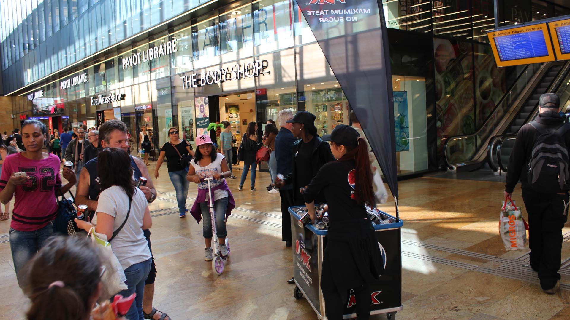 Für unseren Kunden PepsiCo verteilten wir rund 200’000 Pepsi Max Dosen an Pendler der 14 grössten Bahnhöfe des Landes. Zur Unterstützung der Live Promotion setzten wir dazu, erstmalig in der Schweiz, lokale Mobile Ads auf dem SBB Wifi-Netz ein.