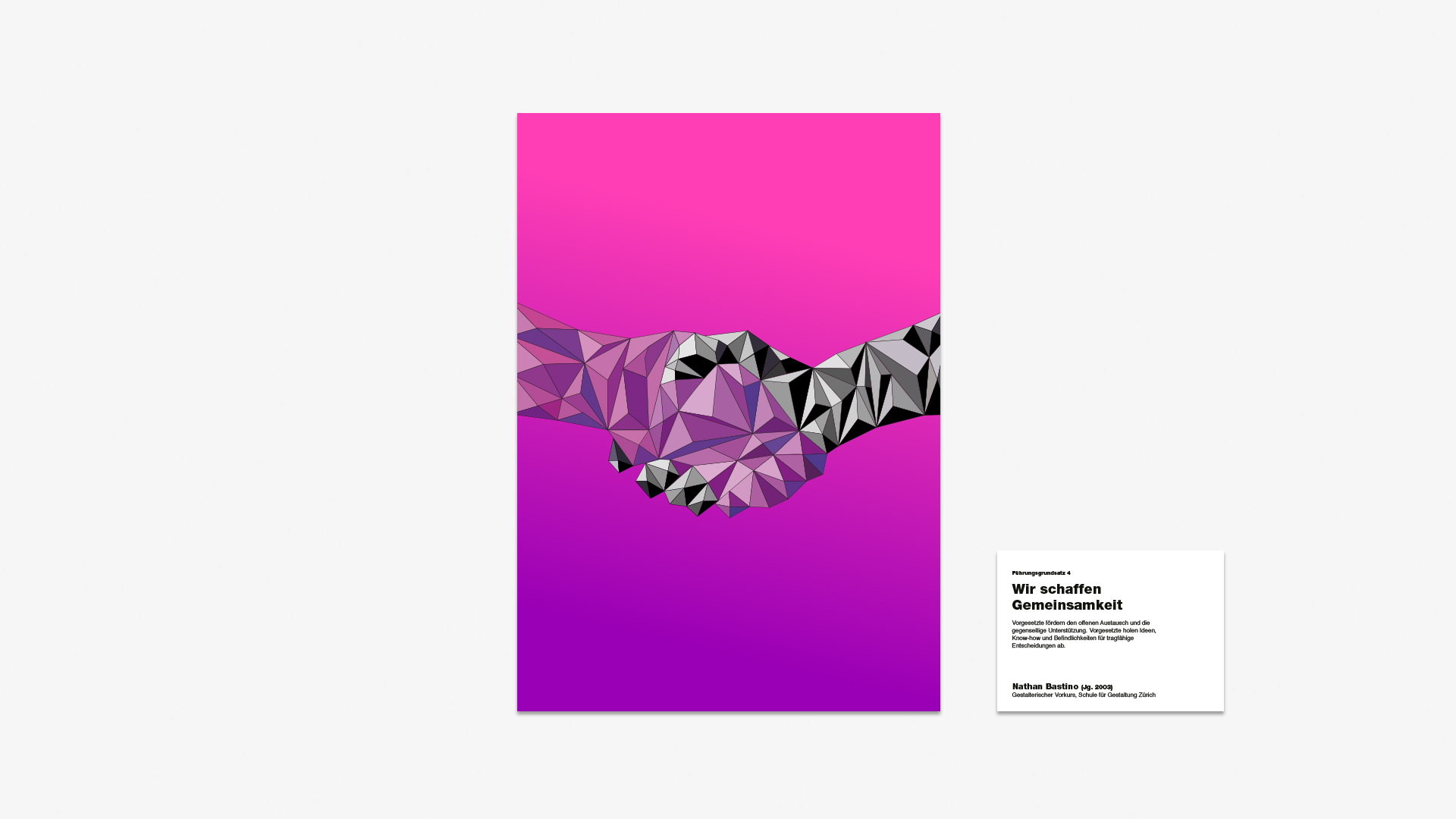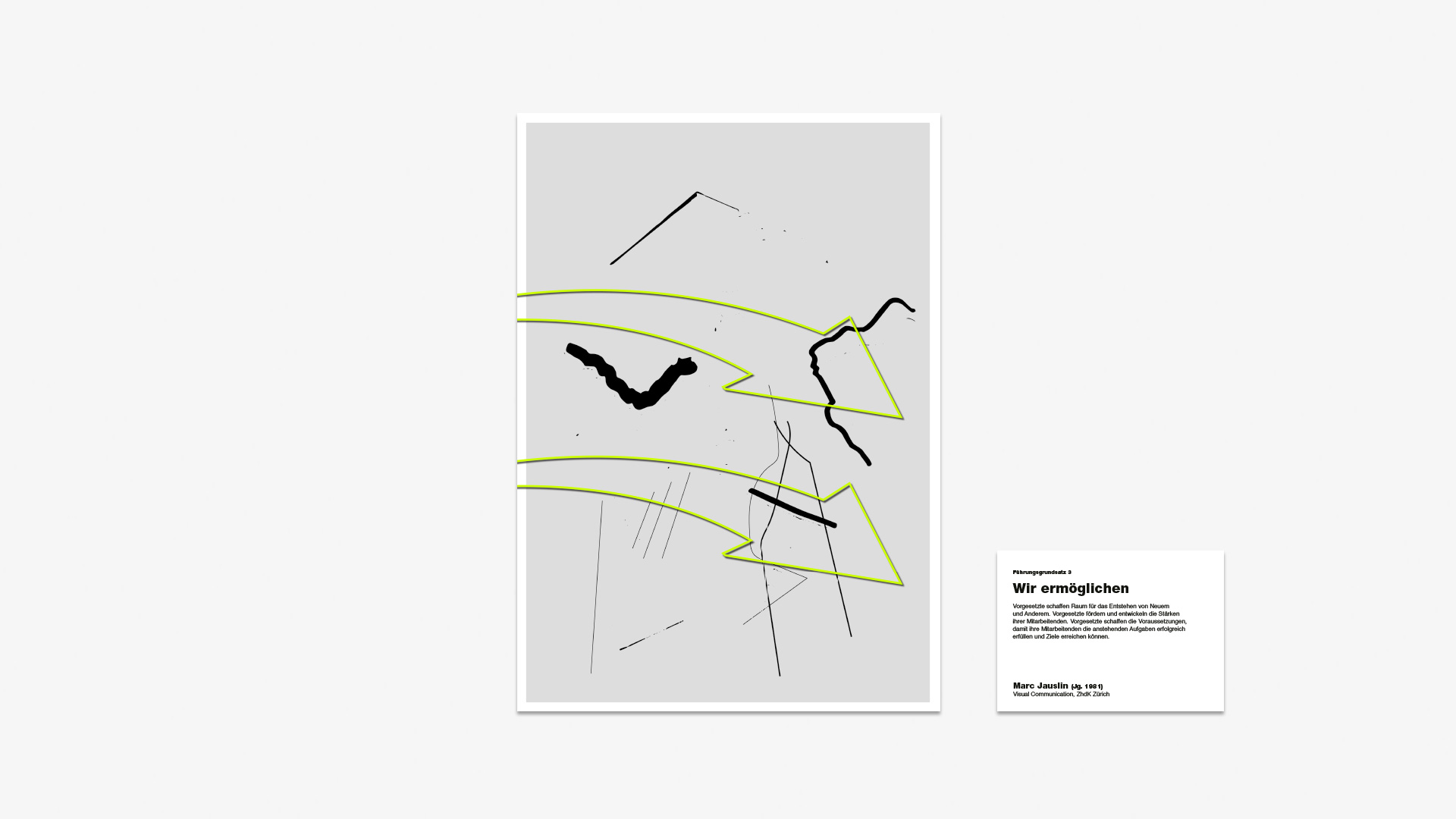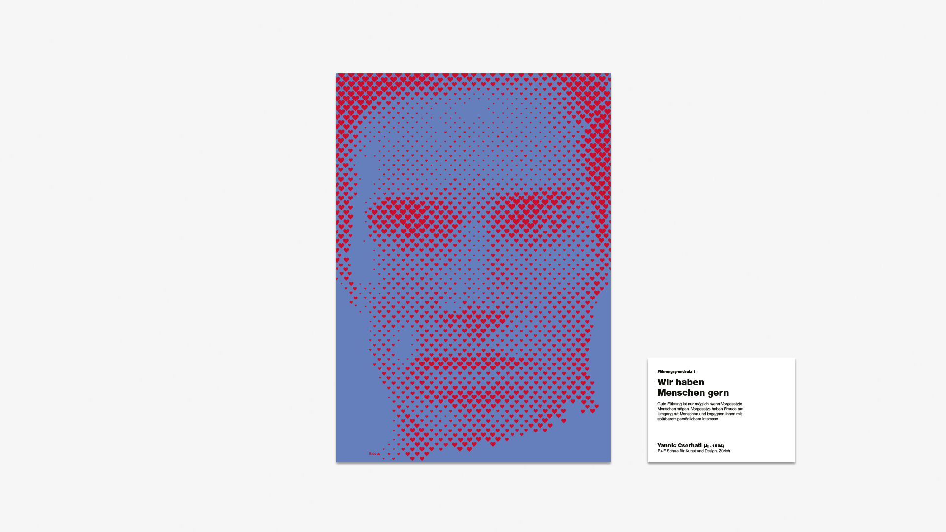 In der zweiten Stufe haben Schüler*innen und Studierende der Schule für Gestaltung Zürich sowie der Zürcher Hochschule der Künste (ZHdK) die Führungsgrundsätze künstlerisch interpretiert und auf einem Plakat visualisiert. Einzige Vorgabe war es, diejenige Farbe zu verwenden, welche für den jeweiligen Führungsgrundsatz steht. Die Plakate wurden den Führungskräften anschliessend in regelmässigen Abständen präsentiert und im Detail erläutert.