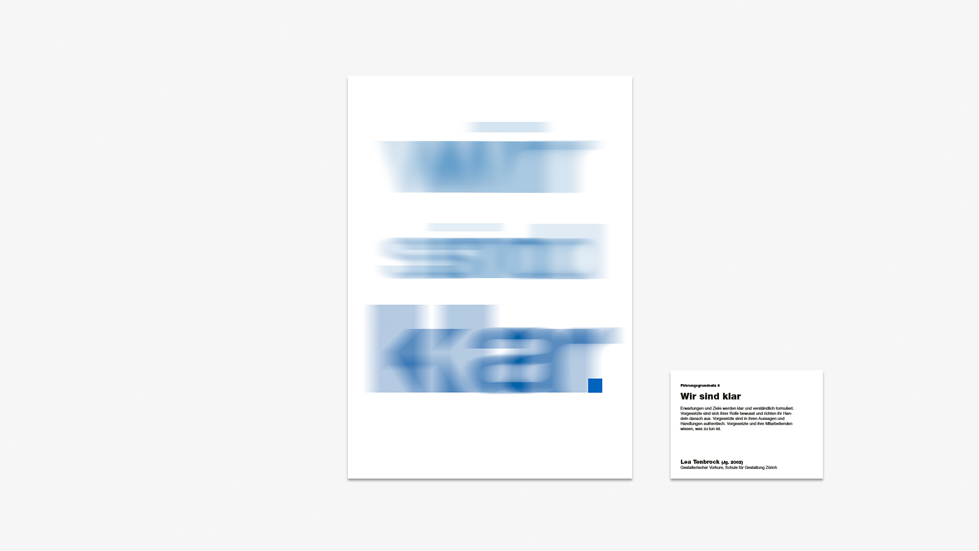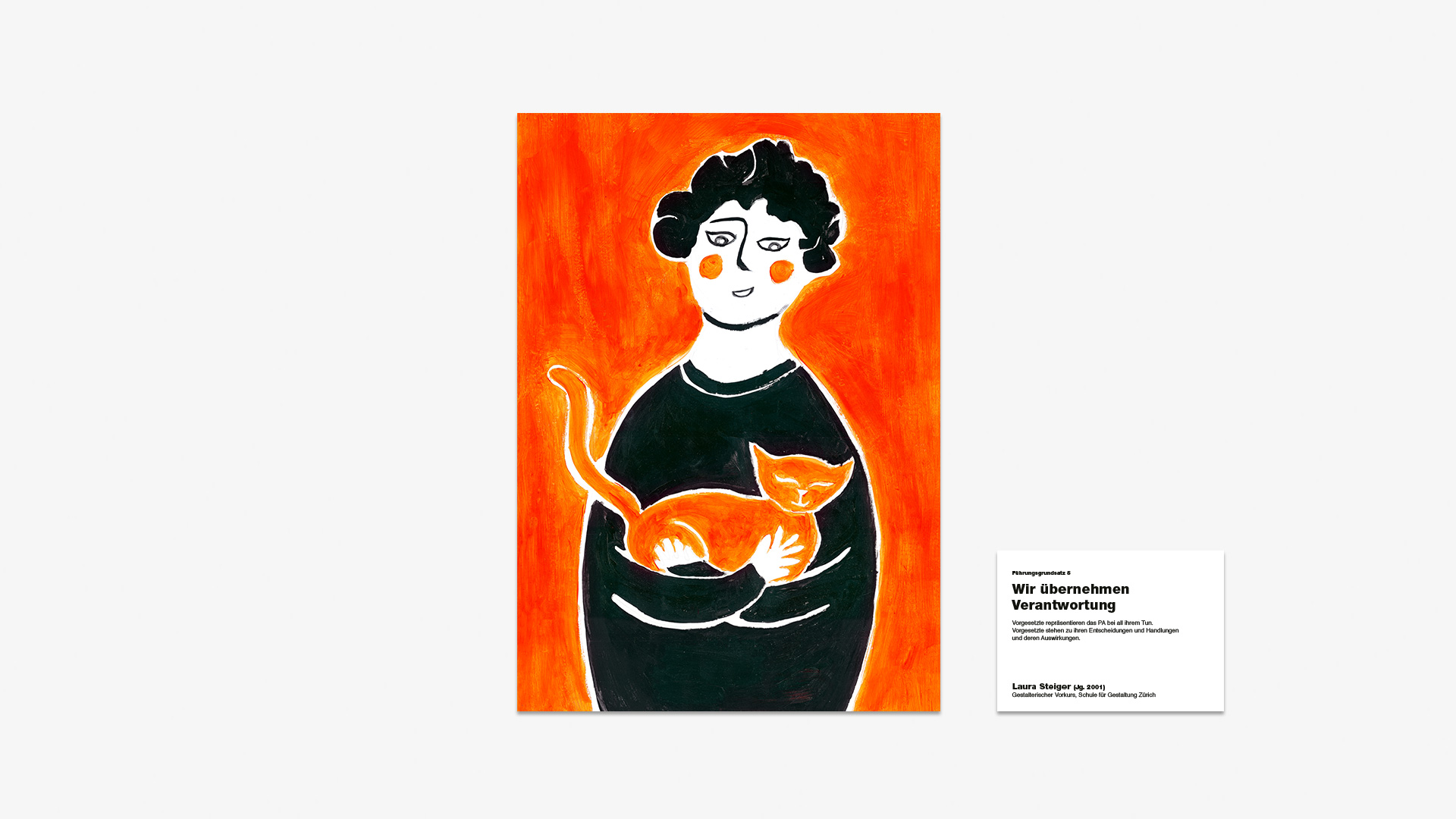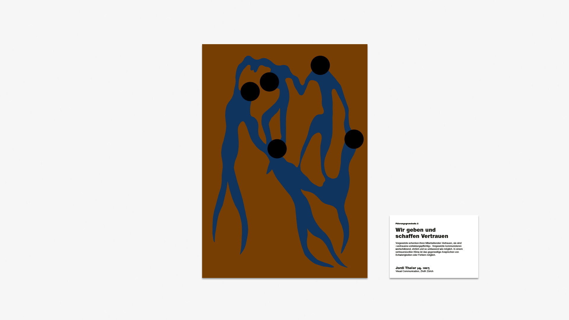 In der zweiten Stufe haben Schüler*innen und Studierende der Schule für Gestaltung Zürich sowie der Zürcher Hochschule der Künste (ZHdK) die Führungsgrundsätze künstlerisch interpretiert und auf einem Plakat visualisiert. Einzige Vorgabe war es, diejenige Farbe zu verwenden, welche für den jeweiligen Führungsgrundsatz steht. Die Plakate wurden den Führungskräften anschliessend in regelmässigen Abständen präsentiert und im Detail erläutert.