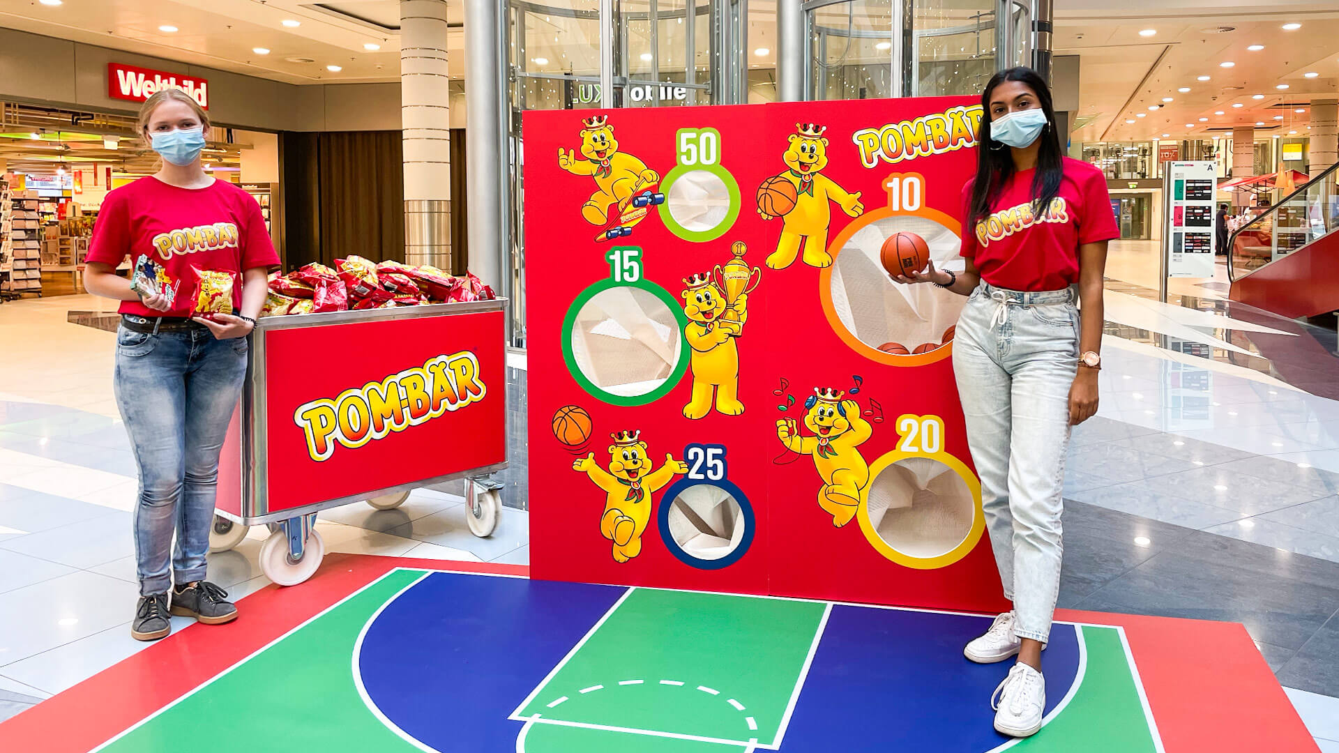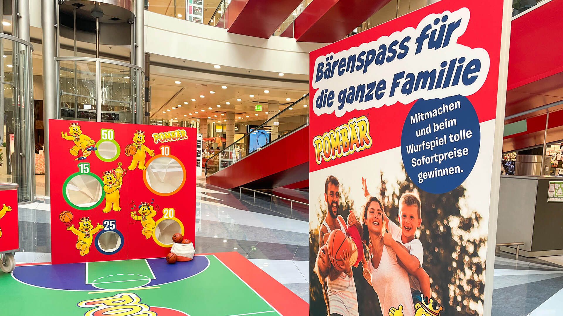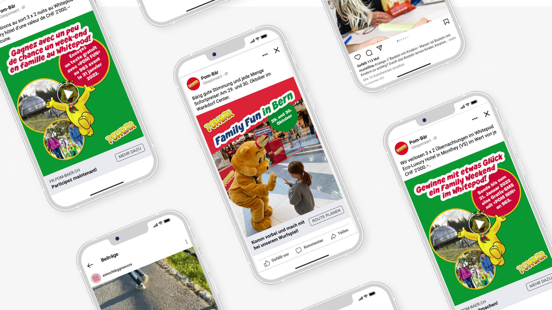 Mit der Roadshow sind wir durch die grössten Einkaufscenter der Schweiz getourt. Um den Familienaspekt in den Fokus zu stellen, haben wir ein Spiel entwickelt, bei dem man als Familie Punkte sammeln konnte: Je mehr Punkte gemeinsam erspielt wurden, umso grösser der Gewinn. Die Laufkundschaft wurde von Promotor*innen mit Produktemustern und einen Wettbewerbs-Flyer auf Neuheiten im Sortiment, Produktrange und Wettbewerb aufmerksam gemacht. Immer mit dabei war unser POM-BÄR-Maskottchen, das für Fotos mit den Kindern zur Verfügung stand.