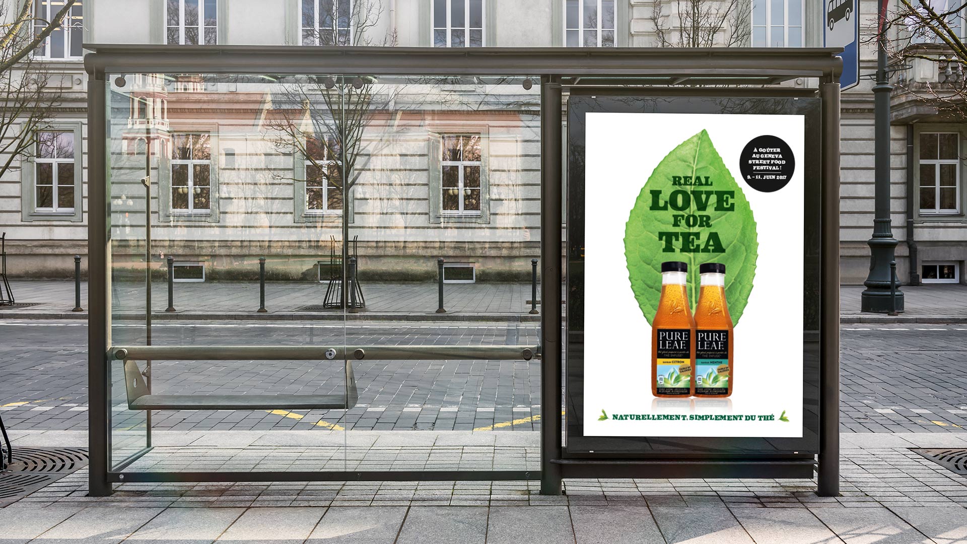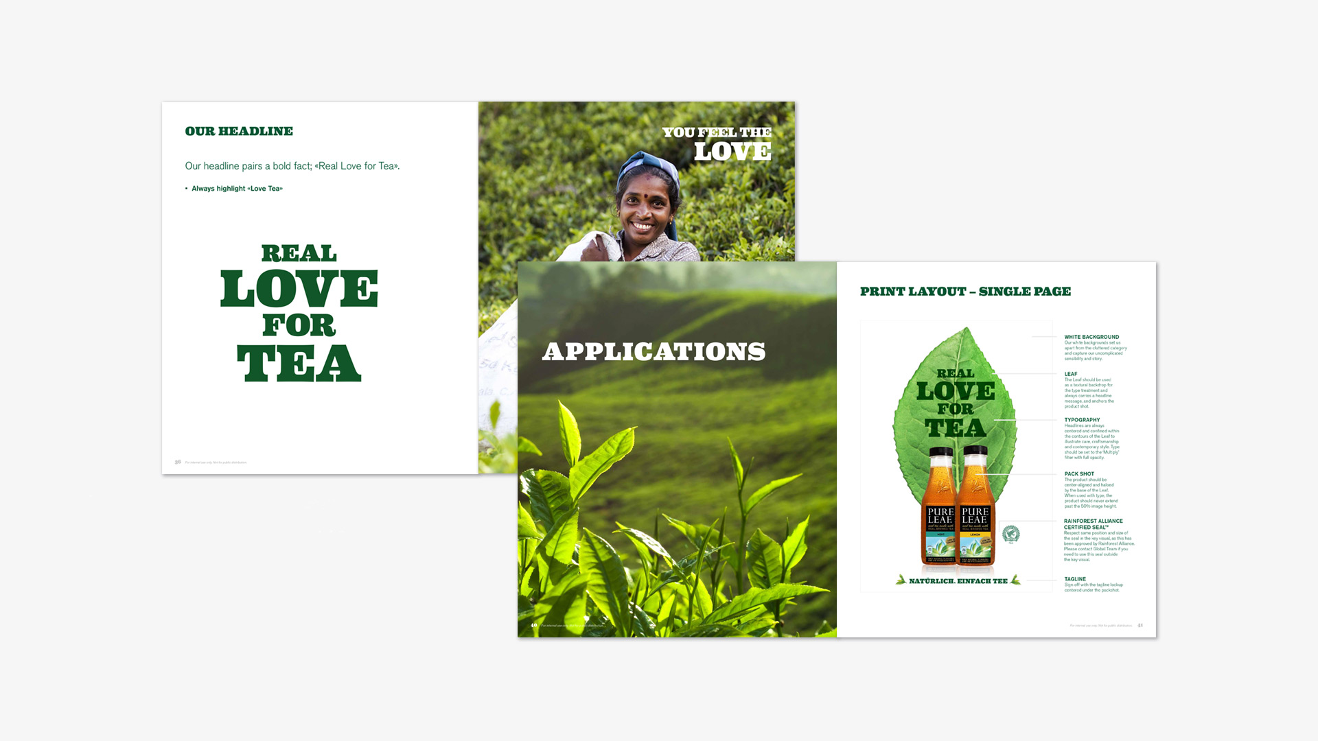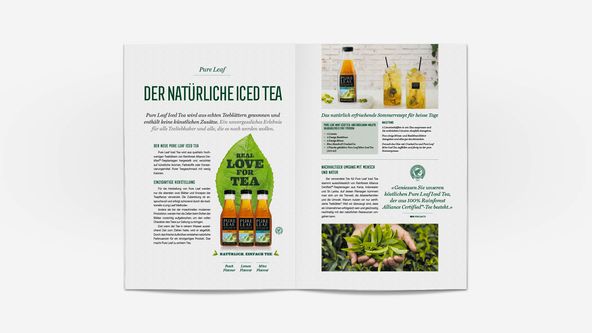 Als Basis wurde zuerst der internationale Styleguide helvetisiert und der Claim «Real Love For Tea» entwickelt. Via diverser Kanäle wurde dem Konsumenten der neue Pure Leaf Iced Tea näher gebracht: Consumer-Inserate, Publireportagen, POS-Displays, POS-Materialien (Totem, Querstopper, Aktions-Bon etc.), OoH-Medien.