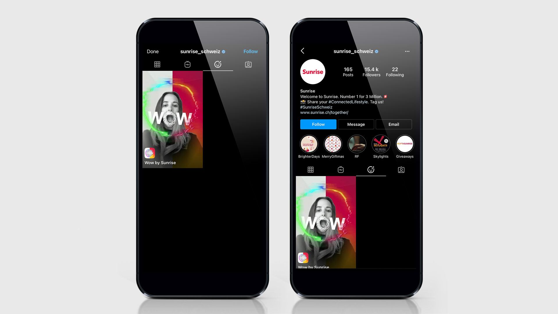 Wir haben für den Merger von Sunrise und UPC einen Instagram-Filter konzipiert und umgesetzt. Ziel war es, den Zusammenschluss der beiden Unternehmen visuell festzuhalten und den Slogan «Zusammen mehr Wow» ins Zentrum zu rücken.