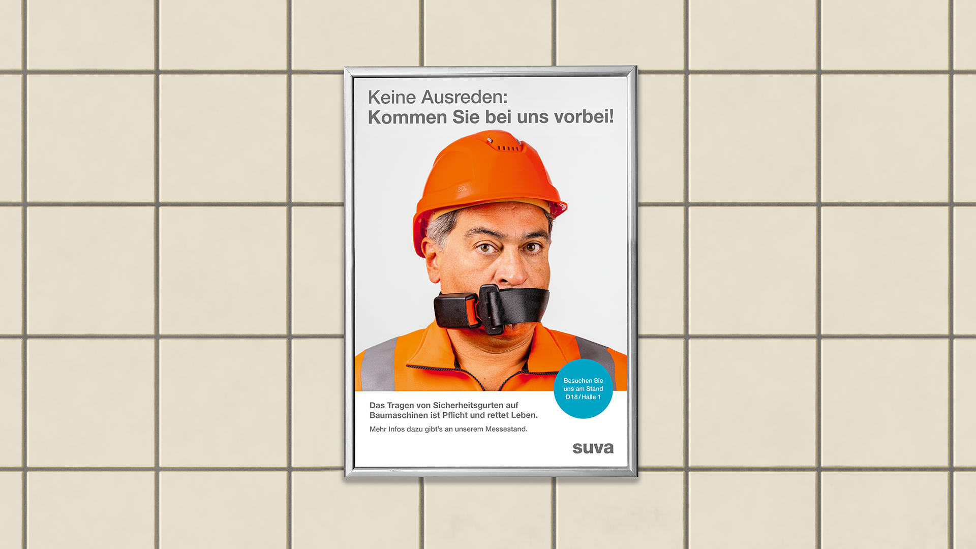 Im Auftrag der Suva haben wir eine plakative Leitidee sowie den BAUMAG-Messeauftritt für das Thema «Anschnallen auf Baumaschinen» entwickelt. Denn trotzdem es im PKW selbstverständlich ist, gibt es immer noch Baumaschinenführer, die sich auf ihren Maschinen nicht anschnallen und stets eine Ausrede parat haben.
