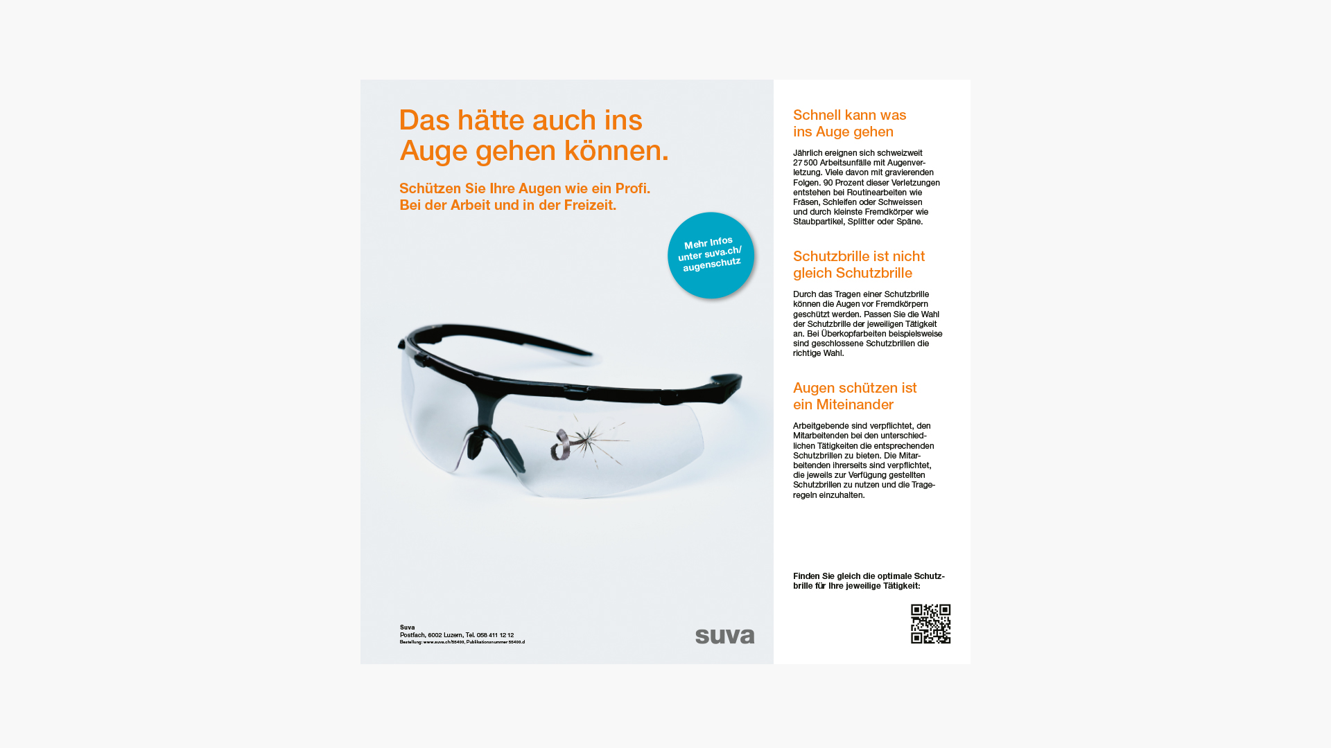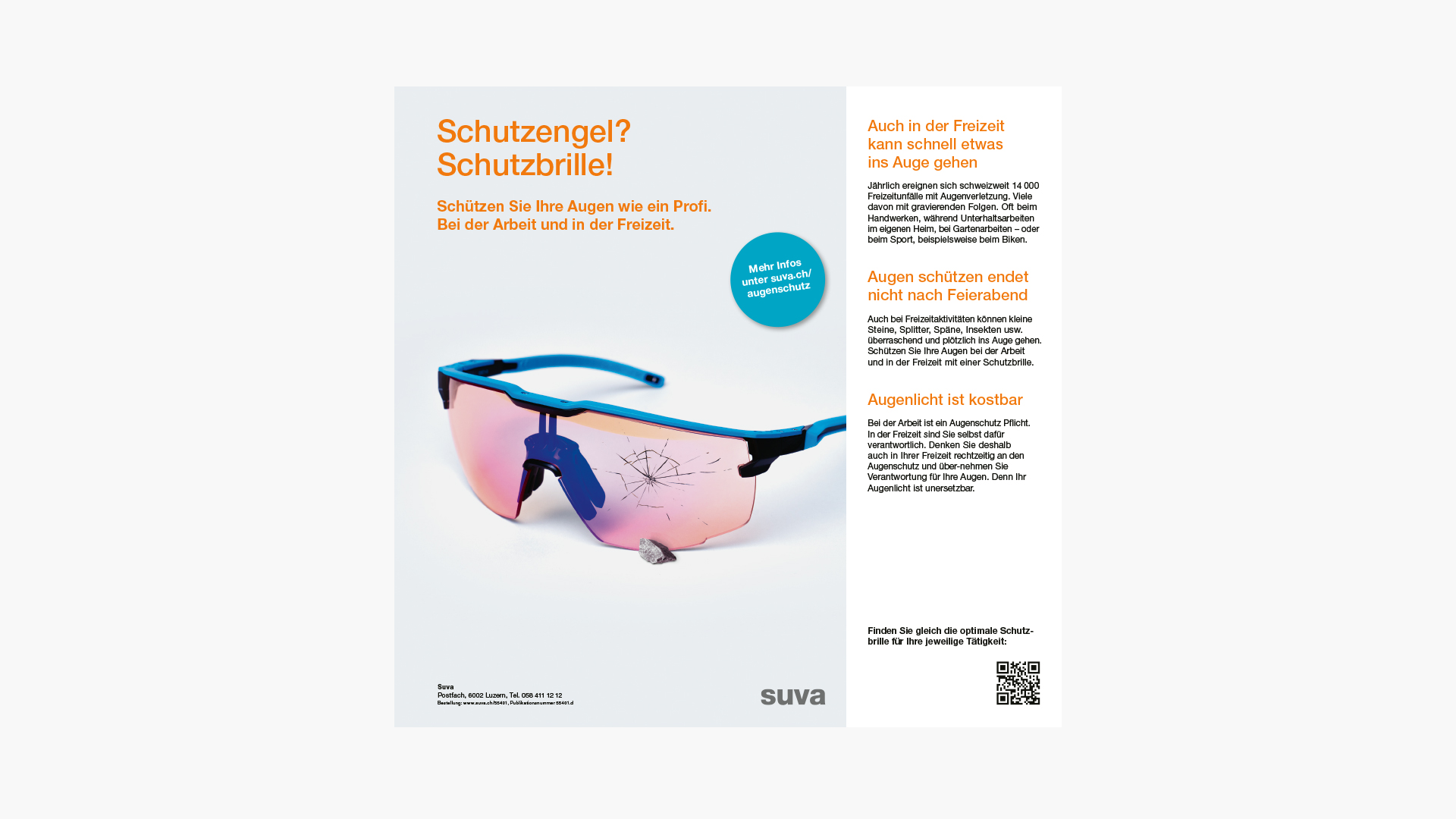 Für unsere neuesten Kleinplakate haben wir uns intensiv mit einem Thema auseinandergesetzt, das in allen Lebensbereichen von grosser Bedeutung ist: Augenschutz. Ziel war es, zu kommunizieren, dass Augenschutz für alle ein Thema ist, egal ob bei der Arbeit oder in der Freizeit. Dafür haben wir zwei unterschiedliche Keyvisuals entwickelt. Auf dem Seitenabtrenner finden sich zudem spannende Fakten und Argumente für das Tragen einer Schutzbrille. Weitere Infos zum Thema gibts hier: suva.ch/gesichtsschutz-augenschutz.