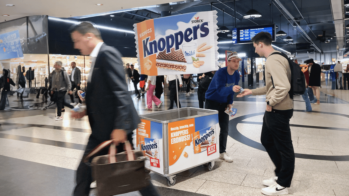 Wir haben uns in diesem Jahr an den grössten Bahnhöfen in der Deutsch- und Westschweiz engagiert und Knoppers Erdnuss Waffeln an Passant*innen verteilt. Mit unseren gebrandeten Promowägeli und den Knoppers-Stellern haben wir für einen ansprechenden Auftritt gesorgt und die Reisenden haben sich über einen kleinen Chnusper-Znüni sehr gefreut.
