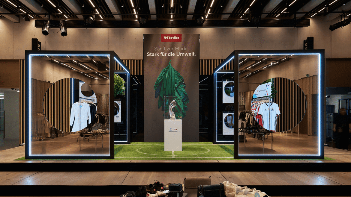 Letztes Jahr stand bei Miele ganz im Zeichen der Women’s EURO 2025, bei der Miele als nationaler Sponsor hautnah mit dabei war. Naheliegend also, dass dieses Engagement auch in den Auftritt am Swap einfliessen sollte. Am Stand von Miele wurden deshalb unter anderem alte Fussballtrikots sowie ein signiertes Shirt der Fussballspielerin und Miele Ambassadorin Naomi Luyet schön in Szene gesetzt und stilvoll in den Gesamtauftritt integriert. Ein besonderes Highlight war zudem die Ausstellung des originalen UEFA-Pokals, dem eine zentrale Rolle bei der Standinszenierung zukam.